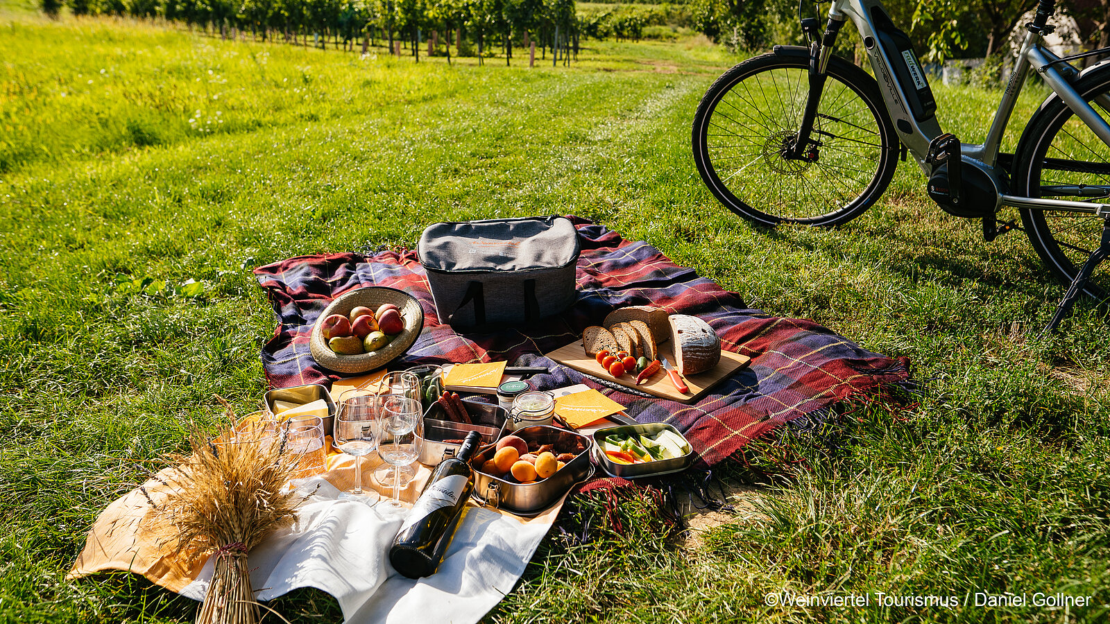 This works perfectly in the Weinviertel: with the Weinviertel picnic. The easy-to-fit bike basket is filled with regional and seasonal delicacies. When you have just found your dream spot for a rest along the cycle route, it's time to enjoy: with bread, pastries, sausage, cheese, spreads, vegetables, fruit and a sweet surprise. Also available as a vegetarian option.